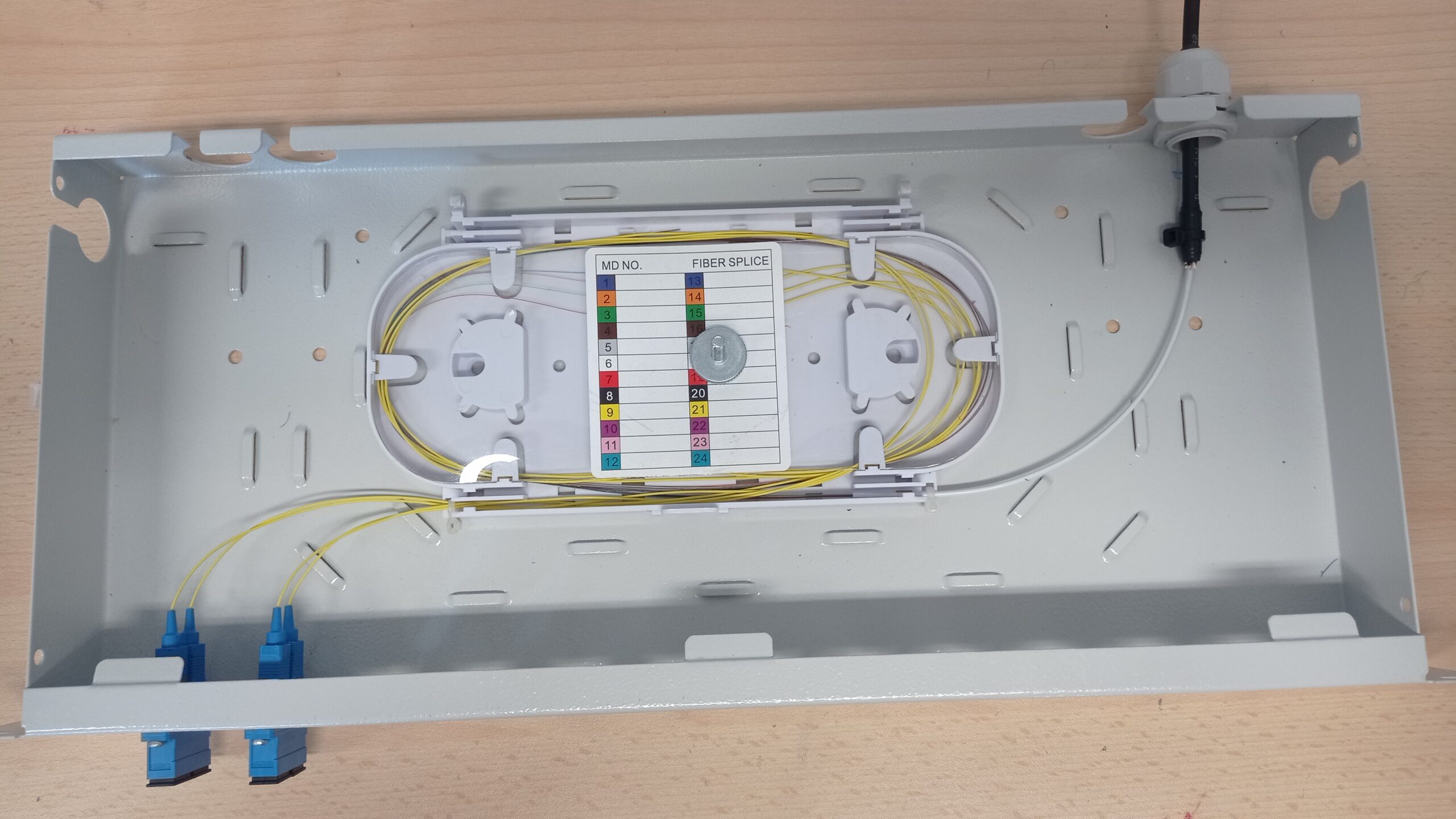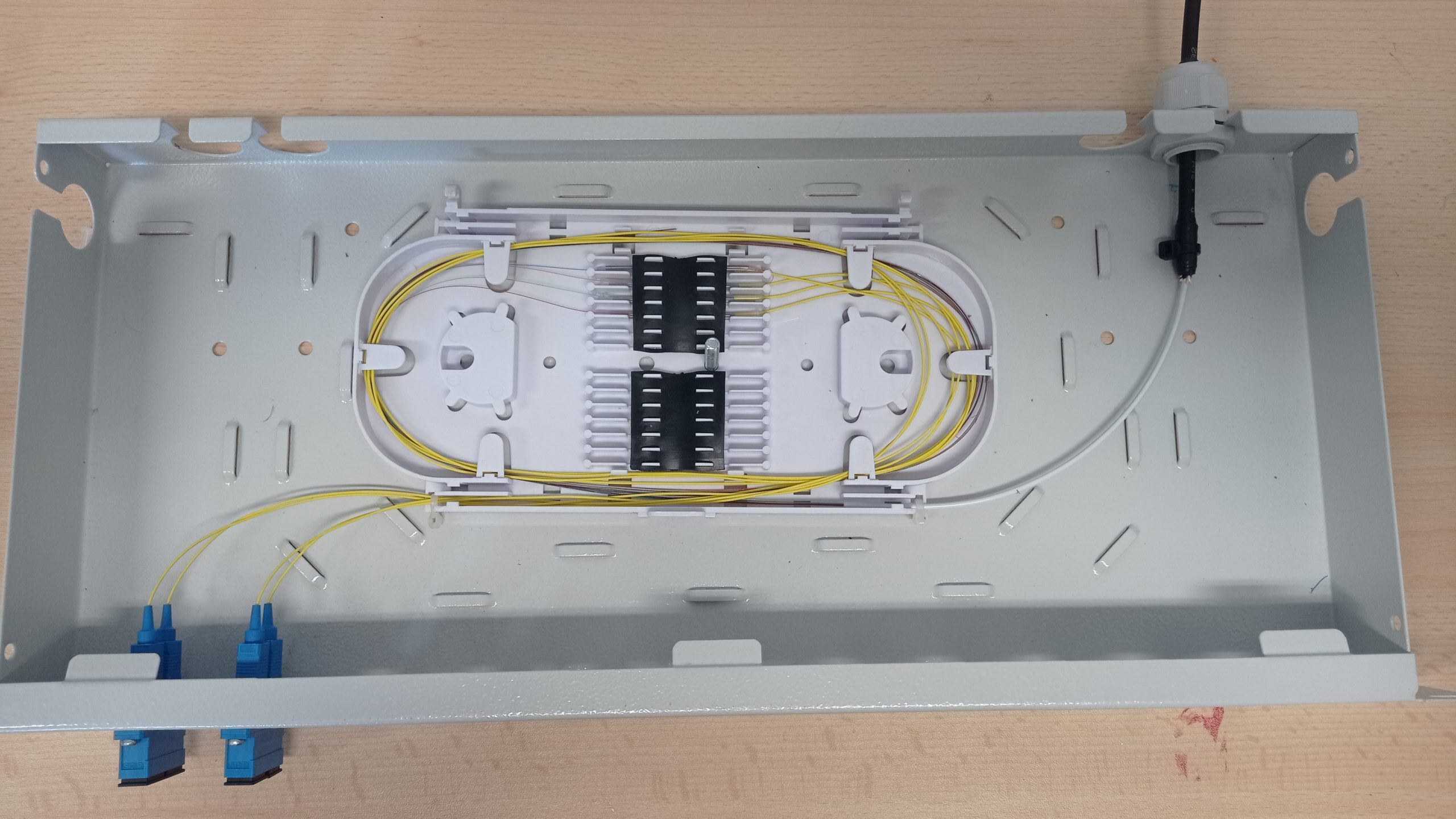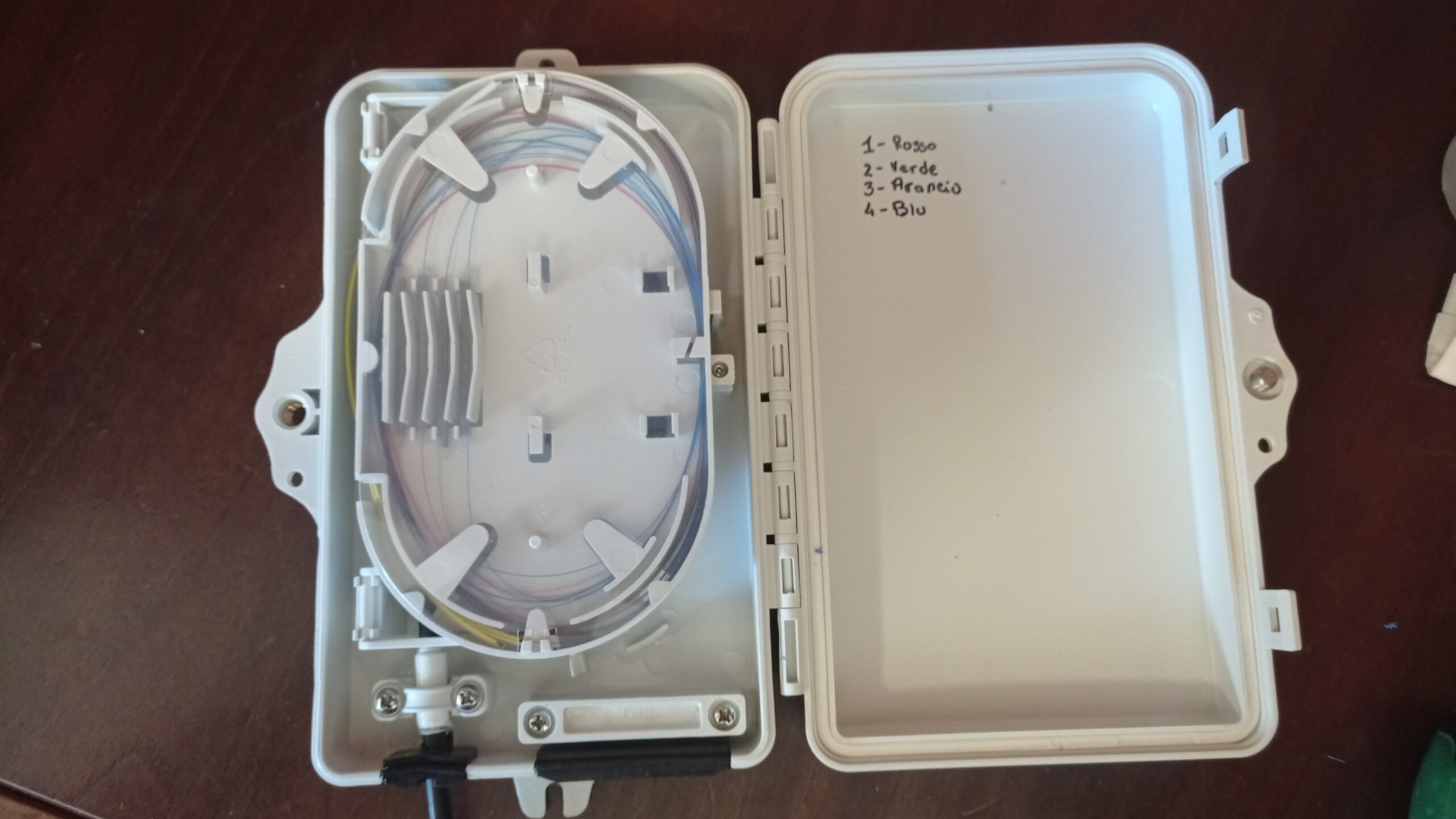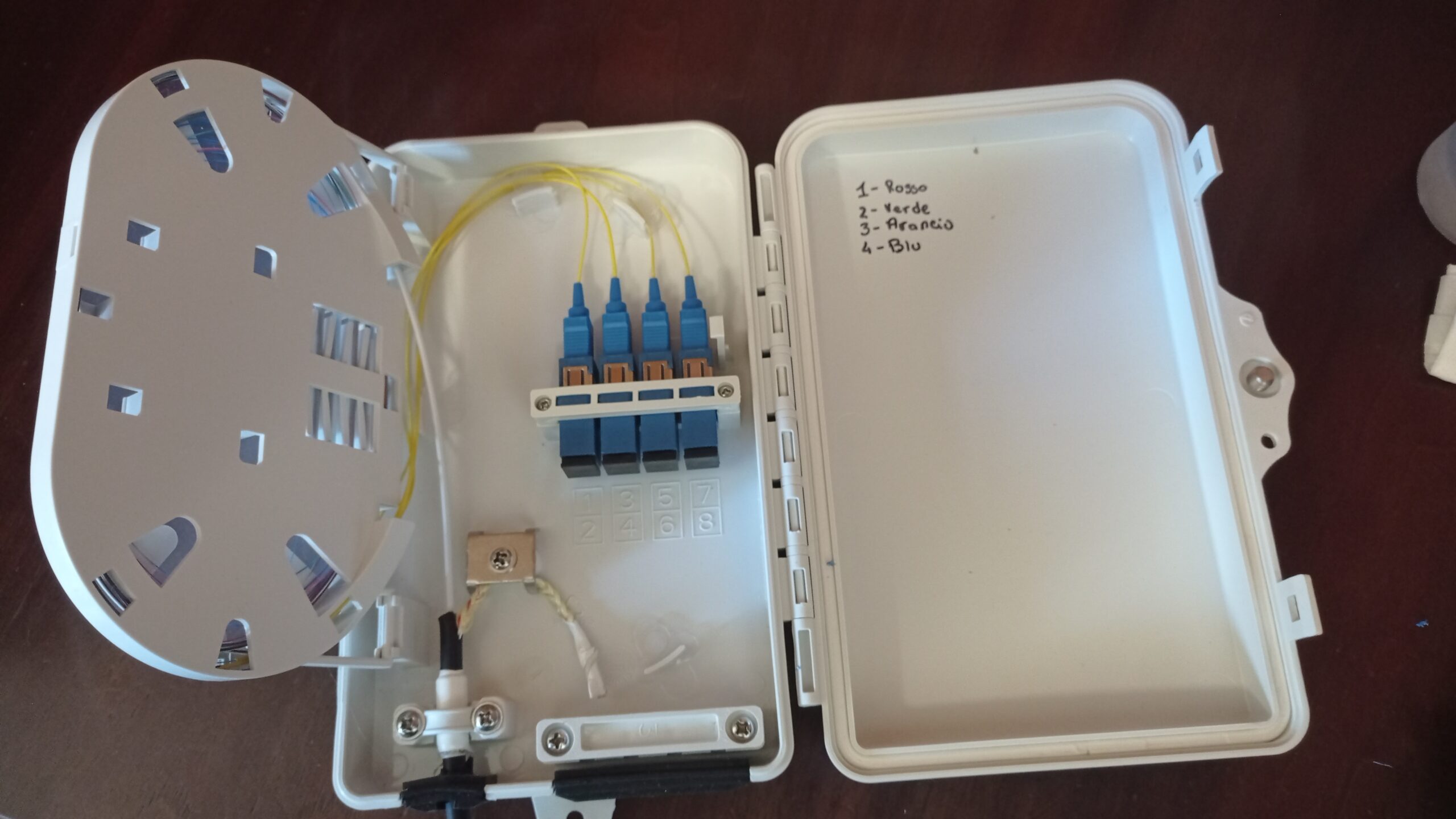 L’installazione ha incluso anche il montaggio di un Box a Parete (terminale di testa) nel quale sono state intestate altre 4 fibre, utilizzando bussole SC Simplex e Pigtail SC/UPC Single Mode. Questa soluzione ha permesso di ottimizzare lo spazio e migliorare la gestione della rete, riducendo al minimo i rischi di malfunzionamenti.